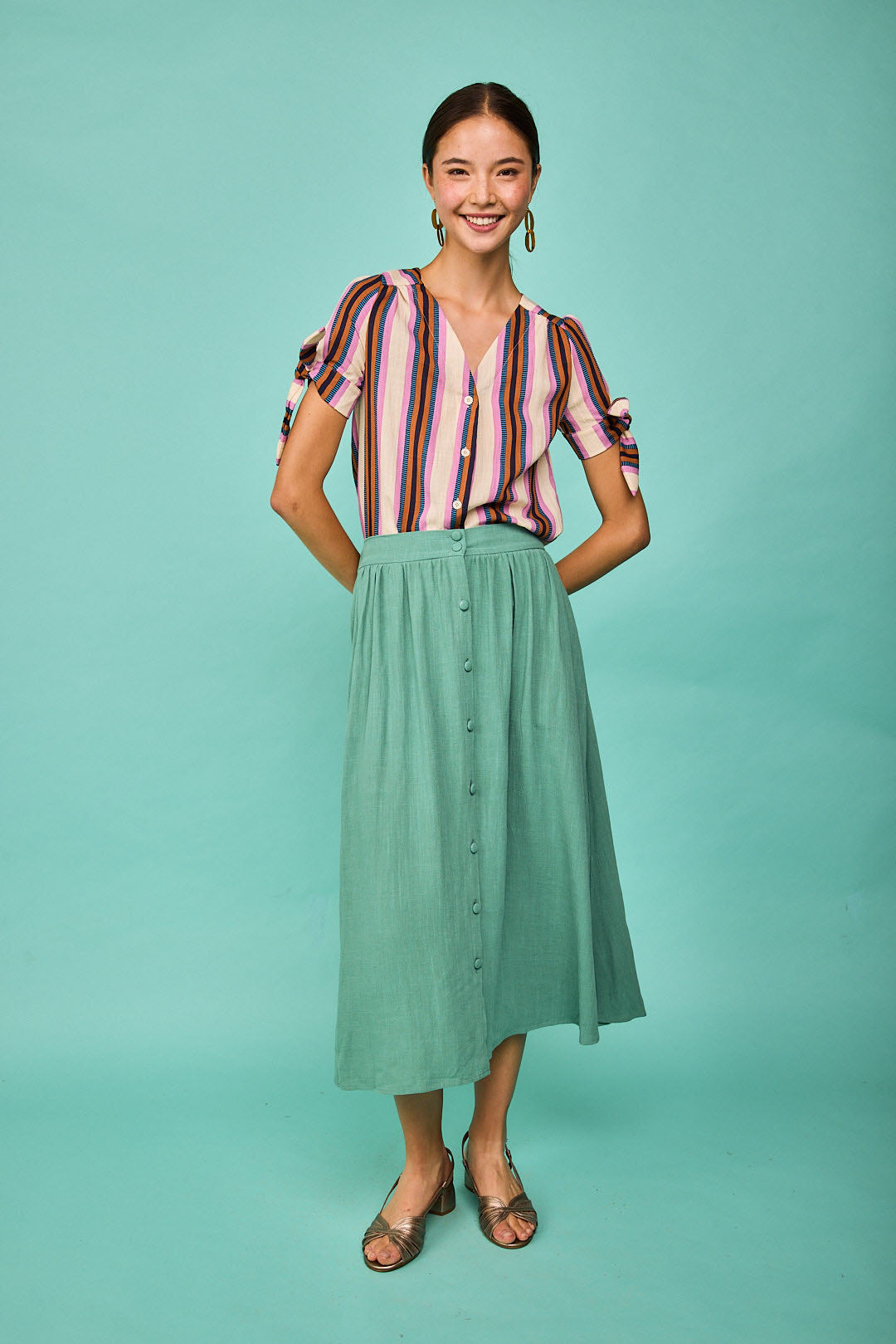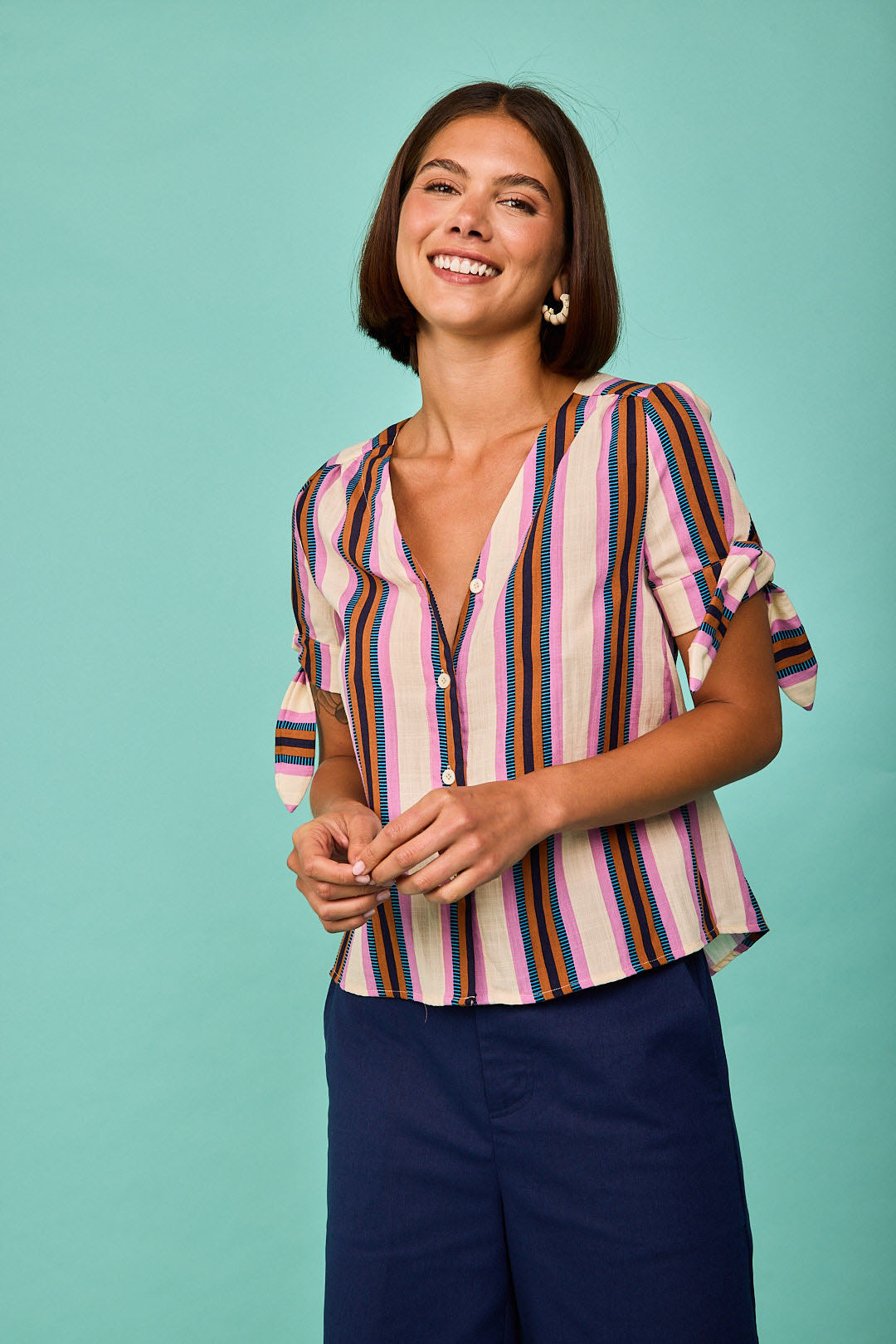 Camisa cuello en pico, abotonada, es ideal lleva una manguita abullonada y lazada en el brazo, La verdad es que monísima!